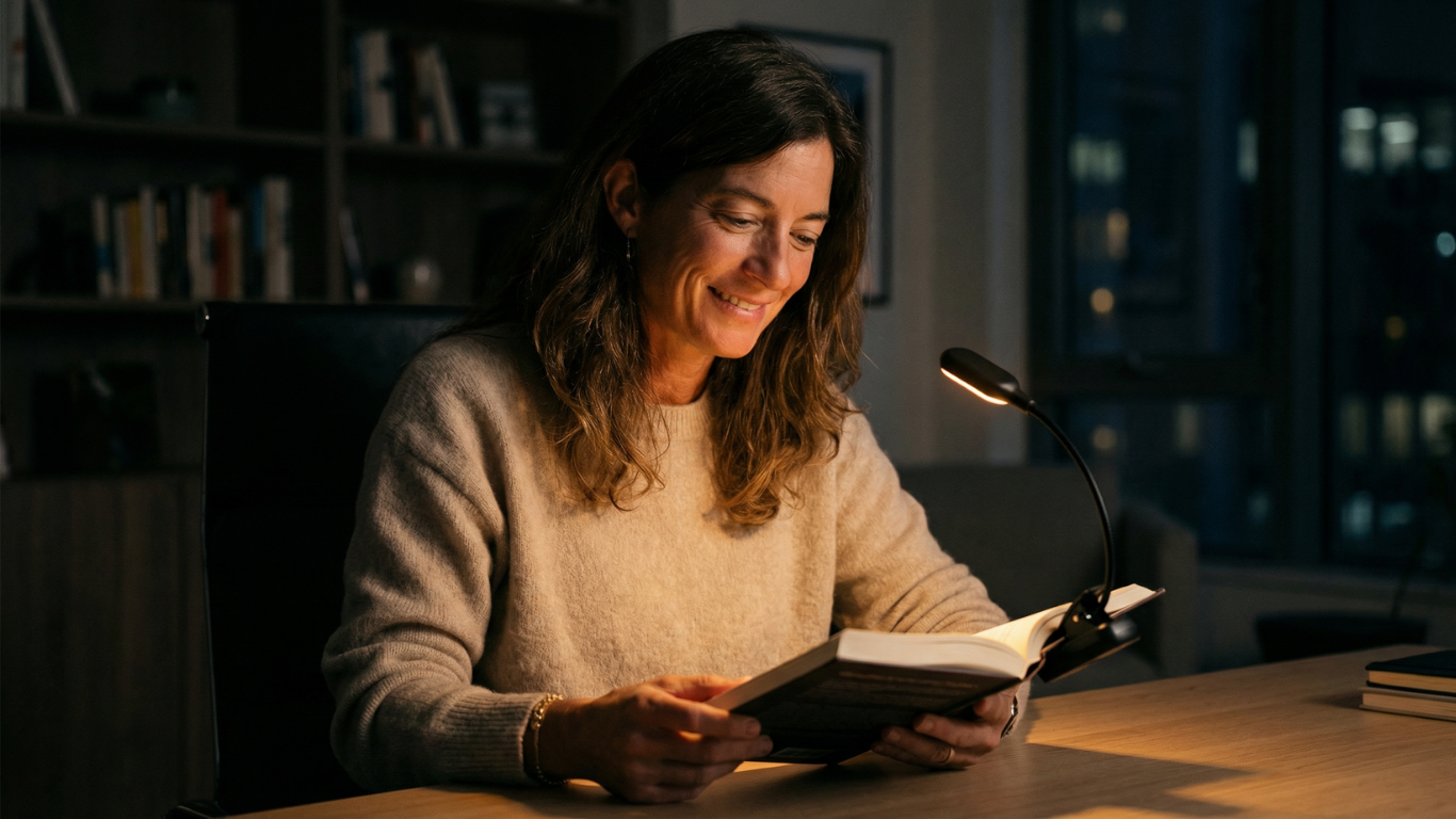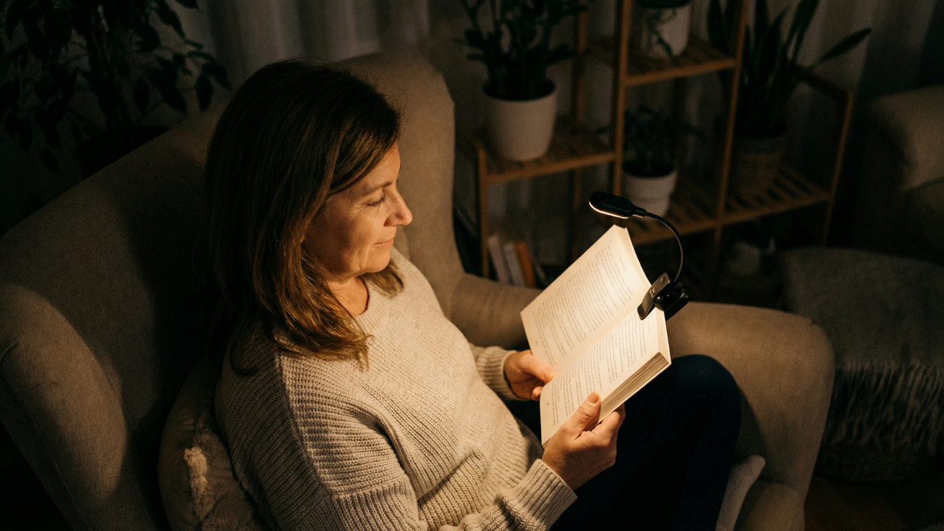 Met de Mvolo Leeslamp PRO hoef je je geen zorgen meer te maken. Geniet van comfortabel lezen zonder dat het je slaap verstoort. Onze leeslamp straalt rustgevend amberlicht uit en biedt de mogelijkheid om de helderheid aan te passen naar jouw voorkeur. Bevestig het lampje eenvoudig op je boek en verstel het zodat het perfect op jouw pagina schijnt.